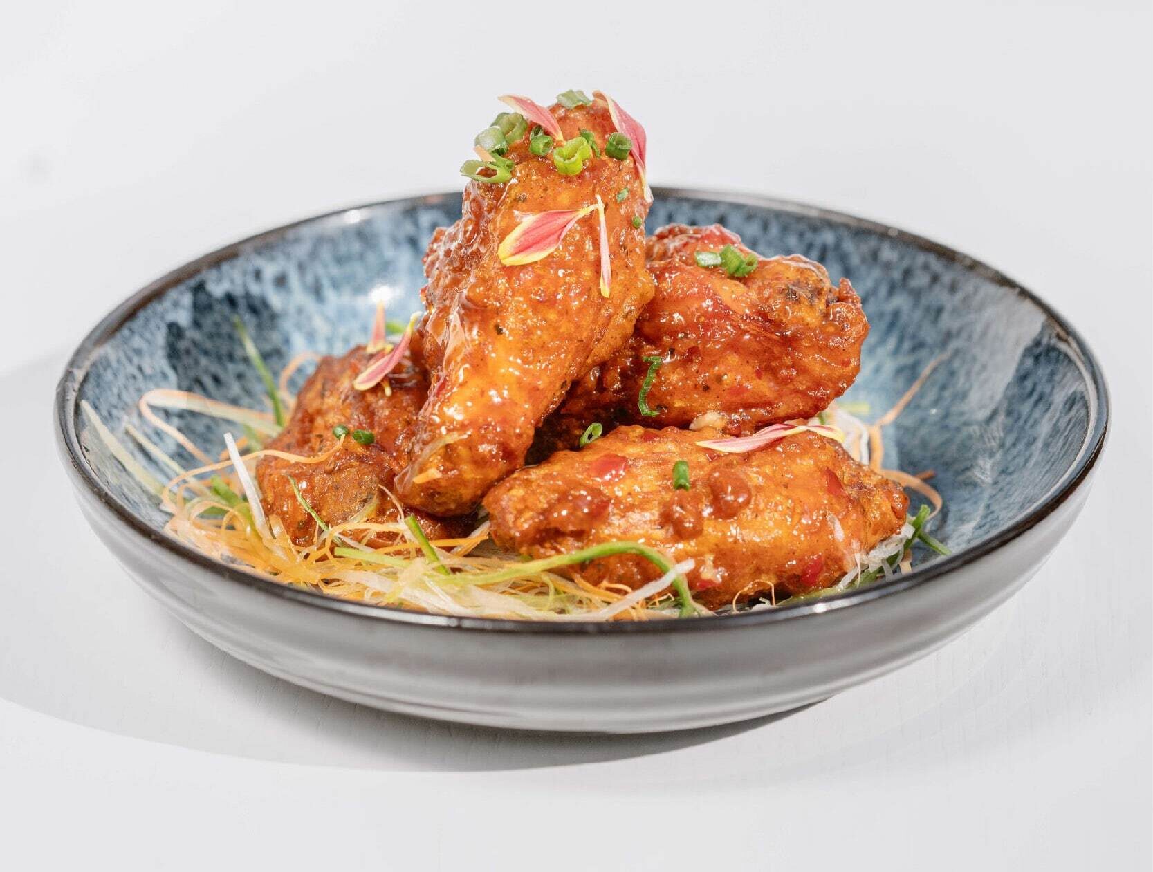 بال مرغ مرینیت شده + بادام زمینی + پیازچه + سوئیت چیلی